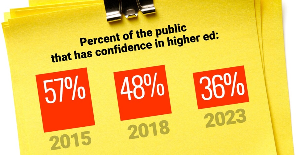 “It’s common knowledge that Americans are losing confidence in higher education. Even so, the numbers that Gallup reported this summer were sobering. Only 36 percent of Americans, Gallup found, have “a great deal” or “quite a lot” of confidence in higher ed. That’s down from 57 percent in 2015 — a drop of more than 20 percentage points in just eight years.